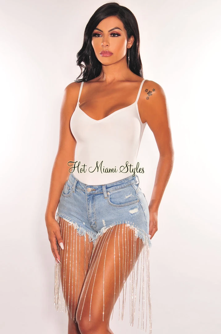 Get ready to drop jaws in these showstopping denim shorts! Features stunning cascading rhinestones.