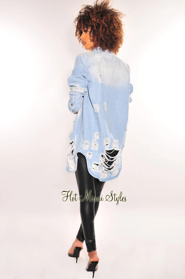 A total must-have chic essential! This denim jacket will amp up any look, Featuring a collared neckline with destroyed details front and back on a shacket silhouette.