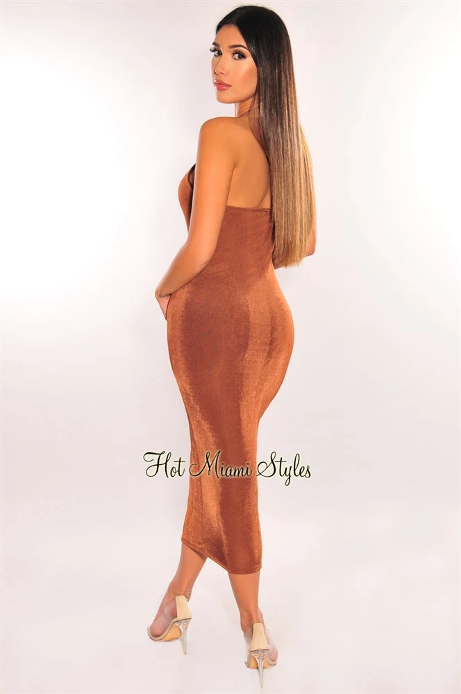 Be ready to leave them speechless when you slip into this gorgeous midi dress. Features a halter open back sleeveless design, made of a beautiful shimmery bodice on the perfect midi length.