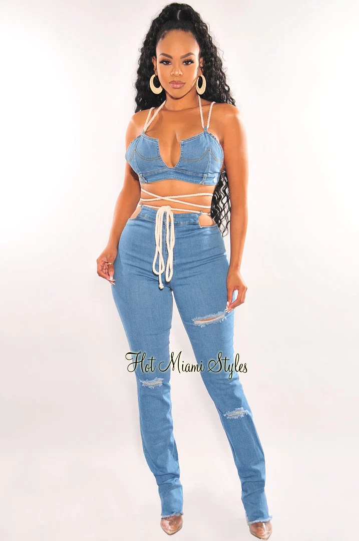 Be the jean queen. This two piece set is made of ultra stretchy denim and includes a padded halter wrap around top and matching ripped high waist pants for the perfect look.