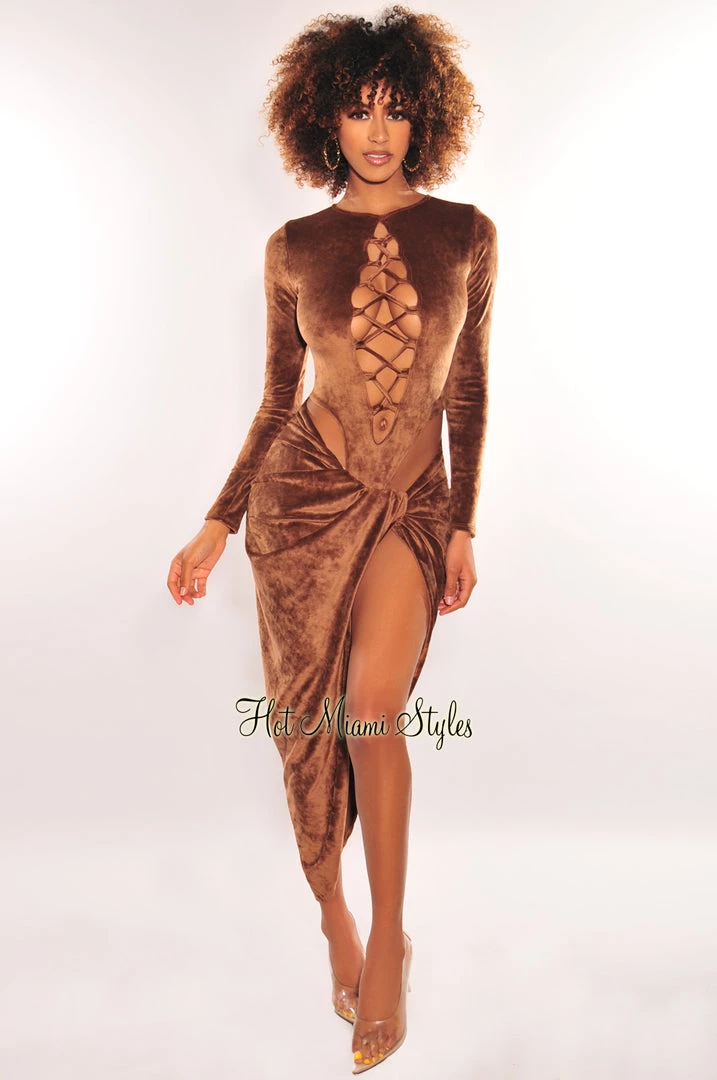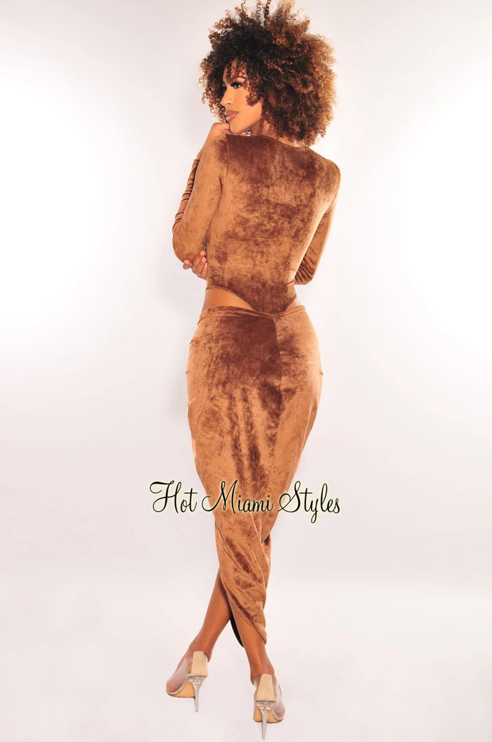 This look is one you can’t pass up! Made with a soft touch suede bodice, featuring a lace up front long sleeve bodysuit paired with a matching slit knotted skirt.