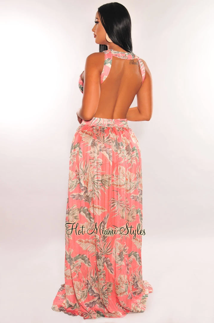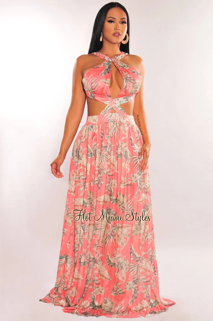 Show up in this floral print maxi dress to steal the show! Designed with an open back on a gorgeous padded bust with cut out details to complete the look on a perfect maxi skirt length dress.