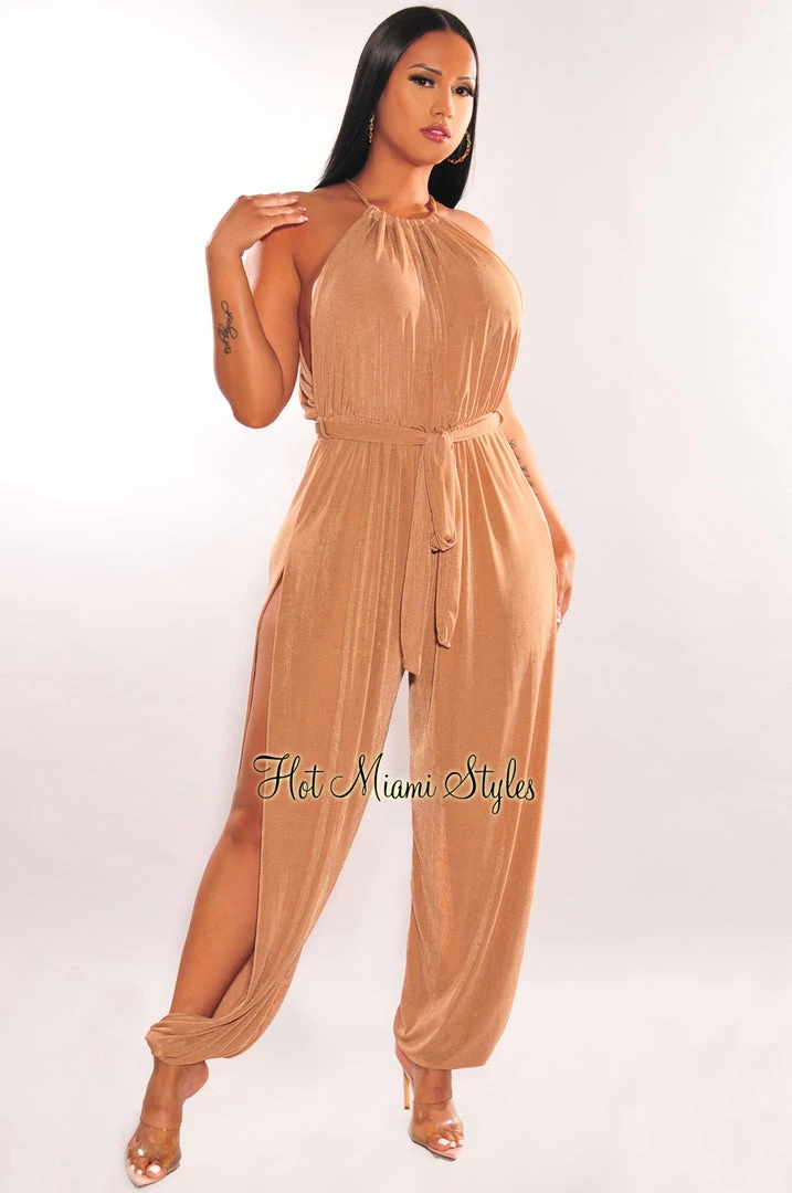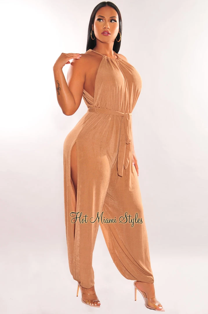 A total wow statement has arrived, this mocha shimmery slit leg harem jumpsuit is ready to conquer all hearts. It’s sexy slit leg silhouette gives your bod the ultimate allure to greet weekend adventures.