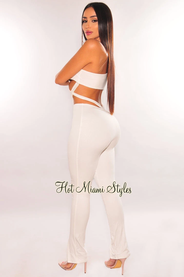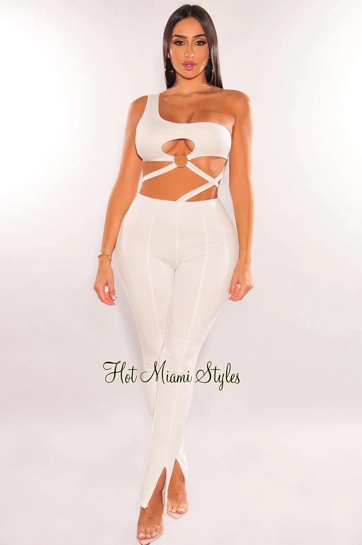 Get weekend ready in this white jumpsuit, designed with an O-ring design, keyhole and cut out for a sleek silhouette that is all types of #outfitgoals.