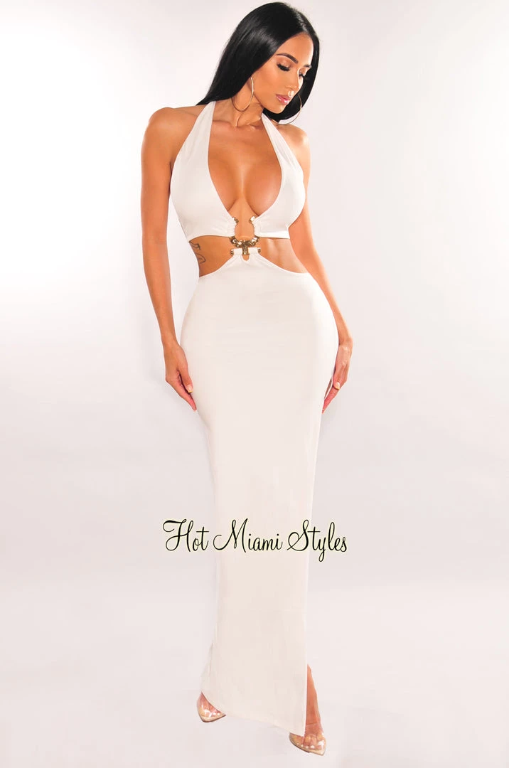 Amp up your wardrobe with this maxi dress. Featuring a halter gold ring detailed neckline, cut out design and sexy slit. This dress will hug your body just right.Â