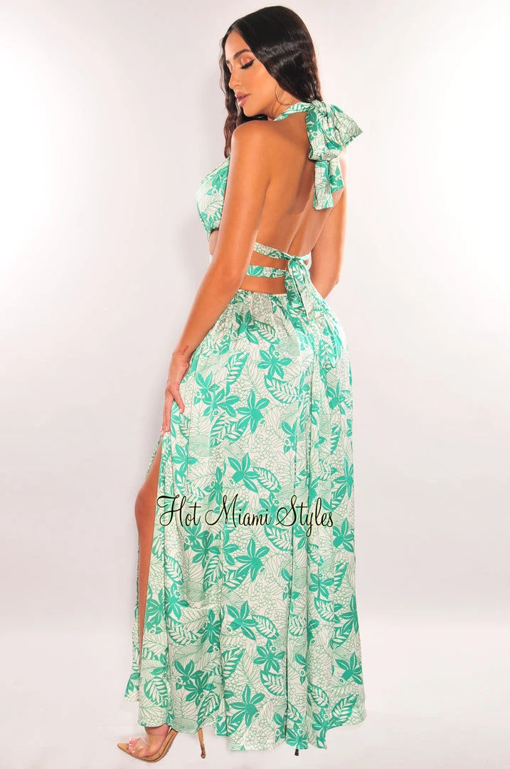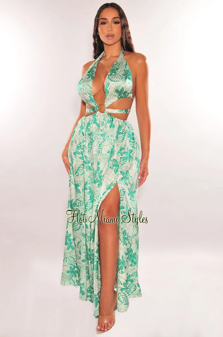 Feel like a total paradise in this fabulous maxi dress. Features a sexy adjustable halter neckline with a wooden O-Ring belt detail on a sultry cutout slit design.