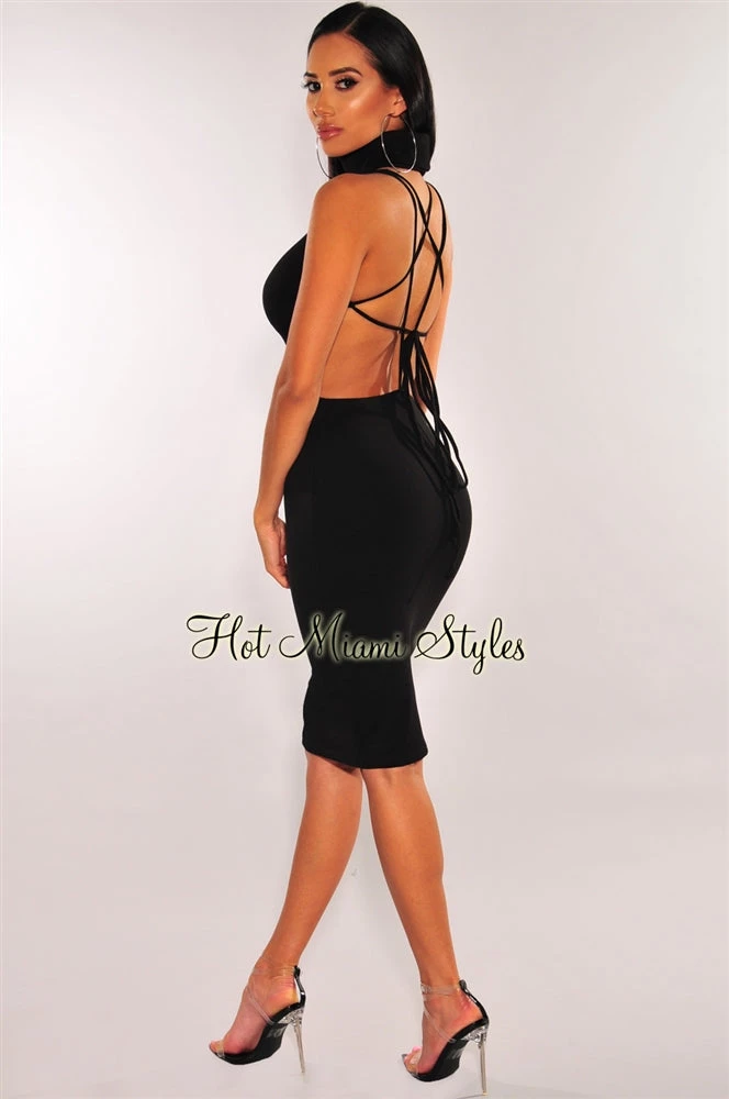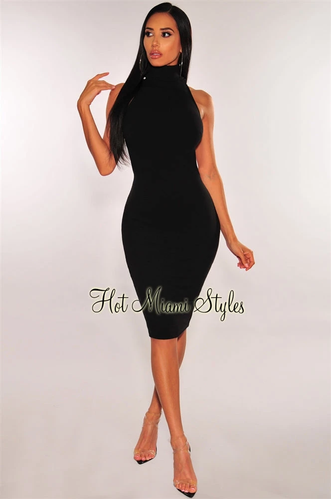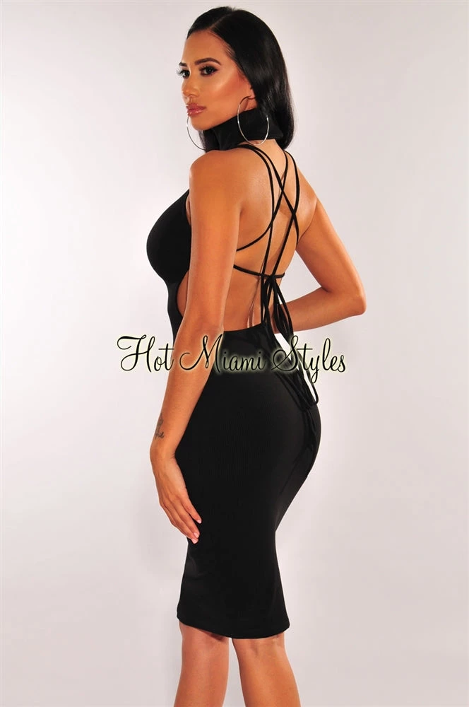 Refine your body this season our black ribbed knit dress. Made with a bodycon silhouette, a lace up back and turtleneck design.
