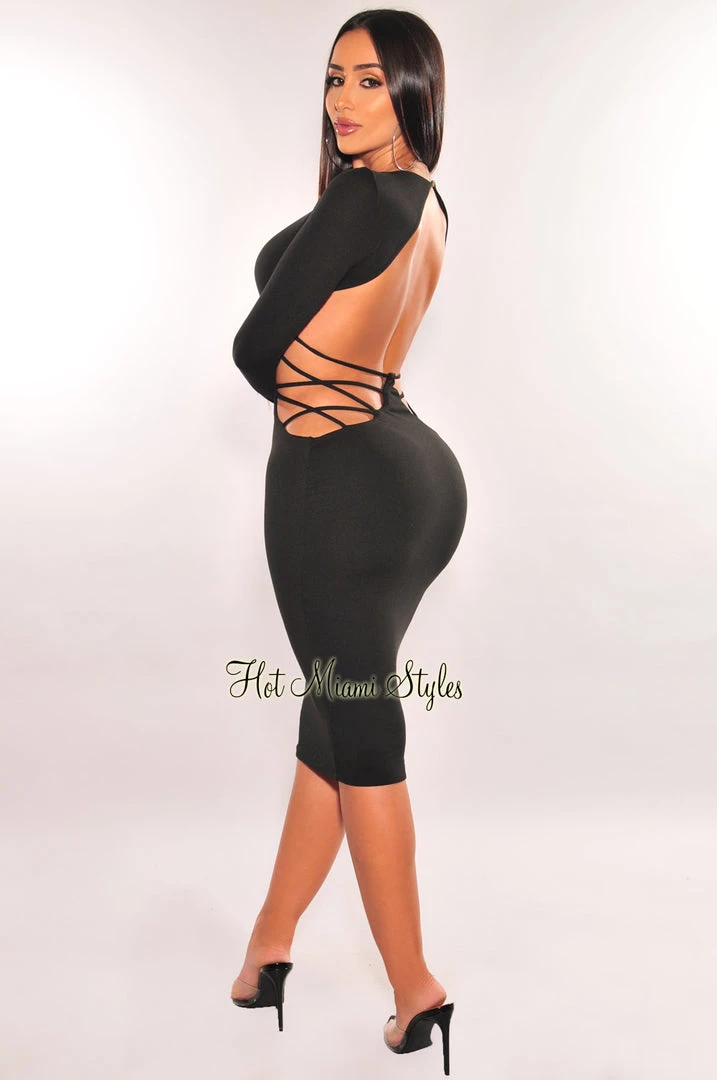 Slip right in this sexy bodycon midi dress. Made to hug and mold your body on a long sleeve v neck design, featuring sexy strappy sides and open back detail to complete the look.