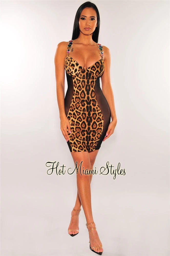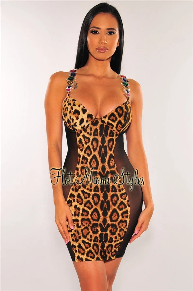 Show off killer looks in this leopard mesh bustier dress. Featuring glistening rhinestones jeweled spaghetti straps, an appealing underwire bustier style for a sexy fit and alluring mesh sides.