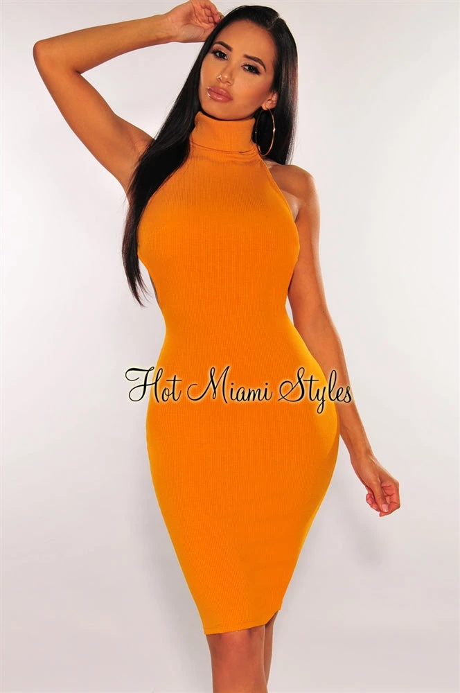 Refine your body this season our mustard ribbed knit dress. Made with a bodycon silhouette, a lace up back and turtleneck design.