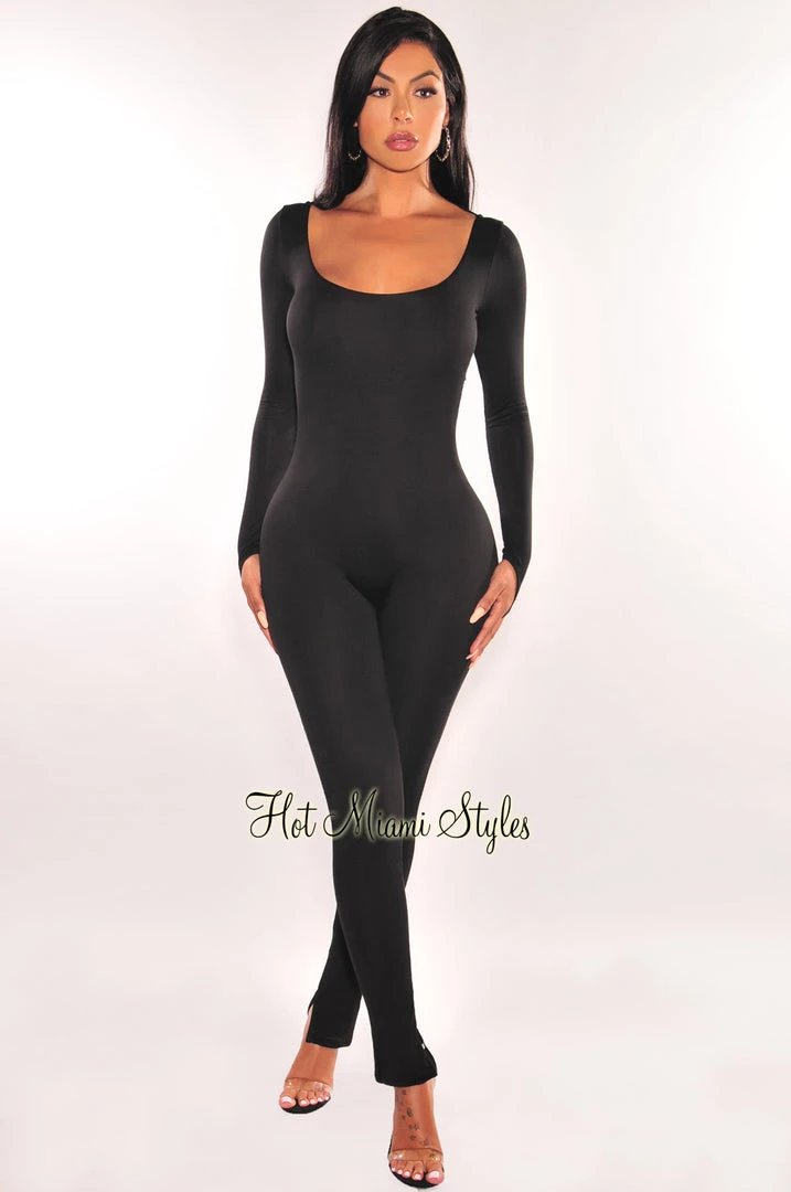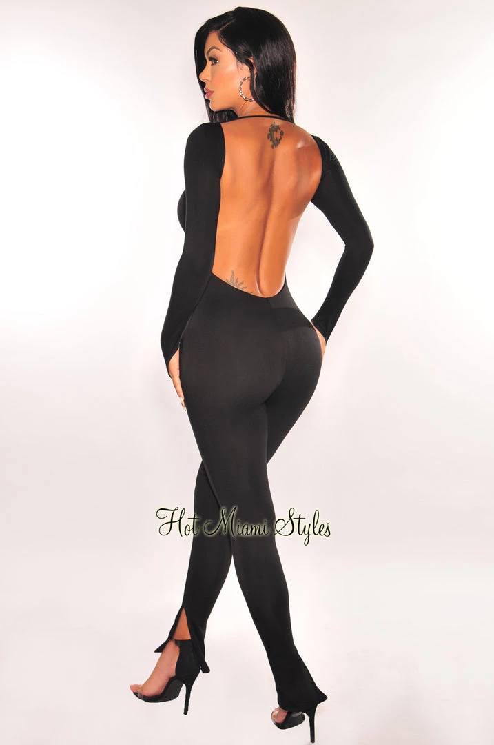 Complete your jumpsuit collection with our black jumpsuit. Detailed with a sultry open back design, scoop neck and long sleeves.Â