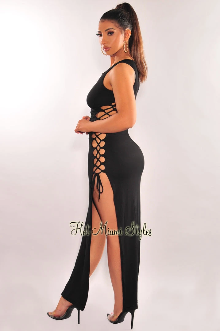 Make a statement in this effortlessly chic maxi dress. Featuring sultry lace up sides and slit.Â