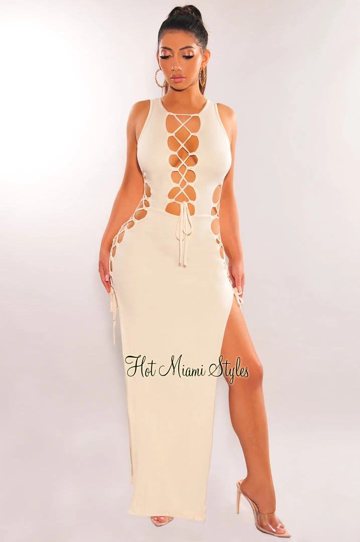 Make a statement in this effortlessly chic maxi dress. Featuring sultry lace up sides and slit.Â