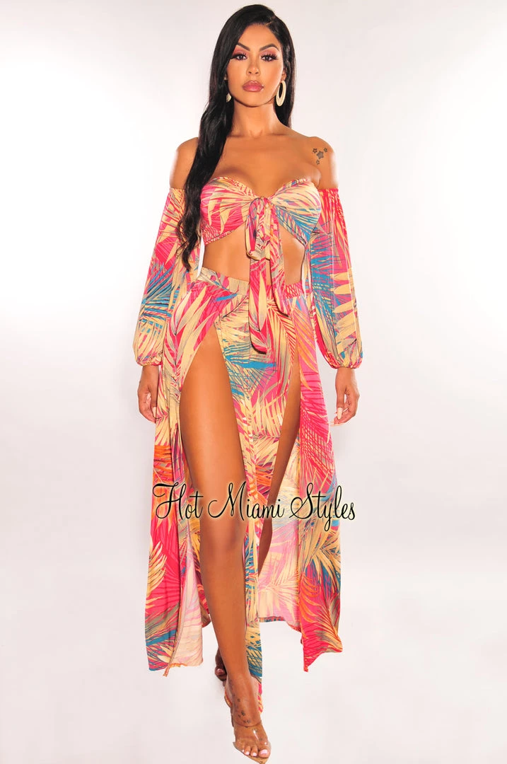 This dreamy set is all kind of goals! Designed with a multi color palm print top with an off shoulder neckline and a double slit maxi skirt that we absolutely love.