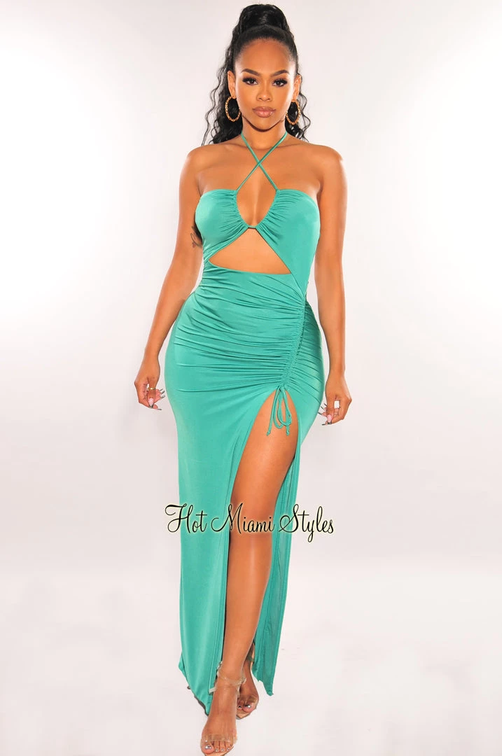 This gorgeous maxi dress will be perfect for your special events! Featuring a halter neckline and a sexy a cut out detail on a ruched slit maxi dress silhouette.Â