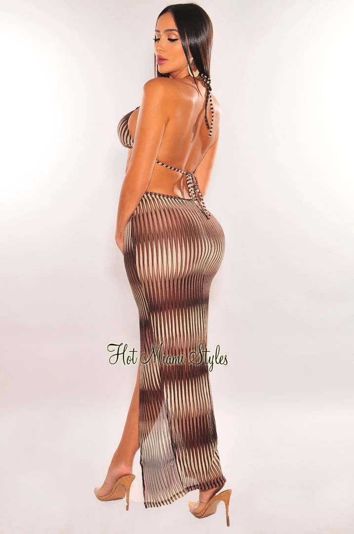 Take your beach look the extra mile with this cover up dress. Featuring a halter neckline, o-ring and cut out details with a sultry slit.