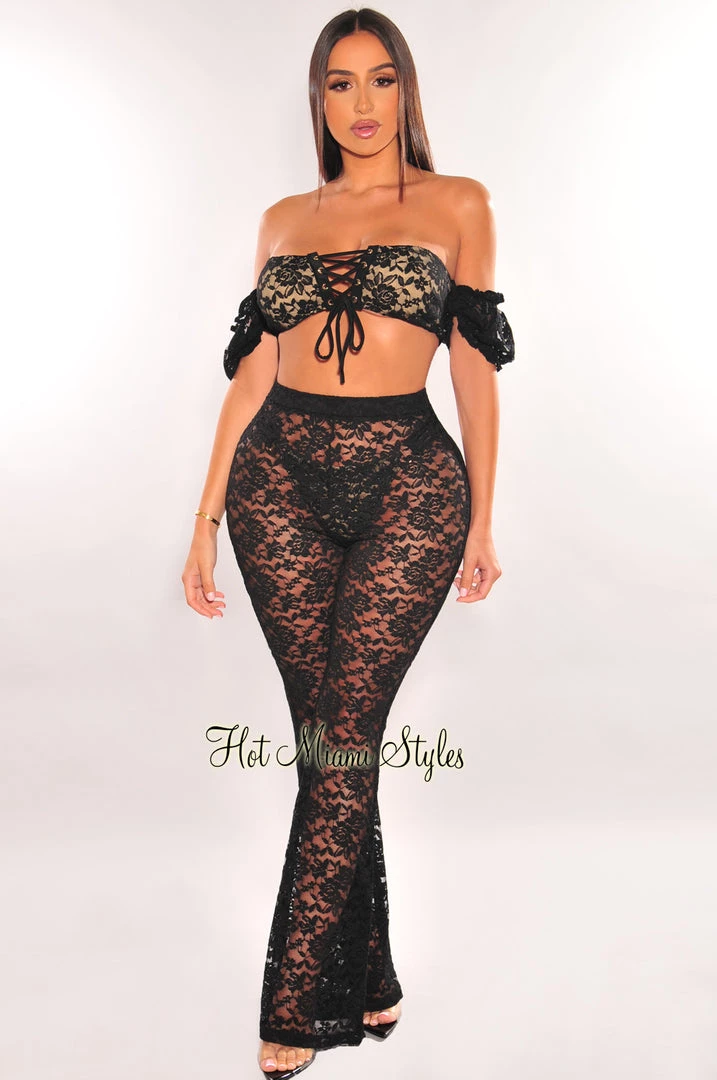 Hollywood & I Just In Black Floral Lace Sheer High Waist Flare Cover Up Pants