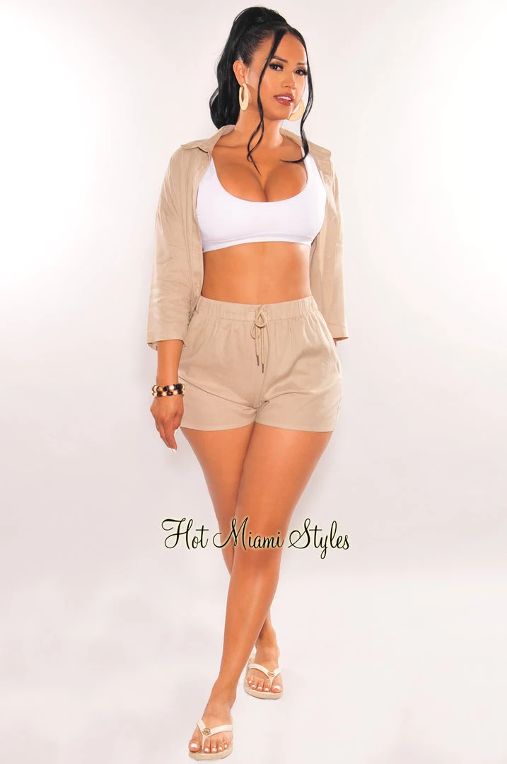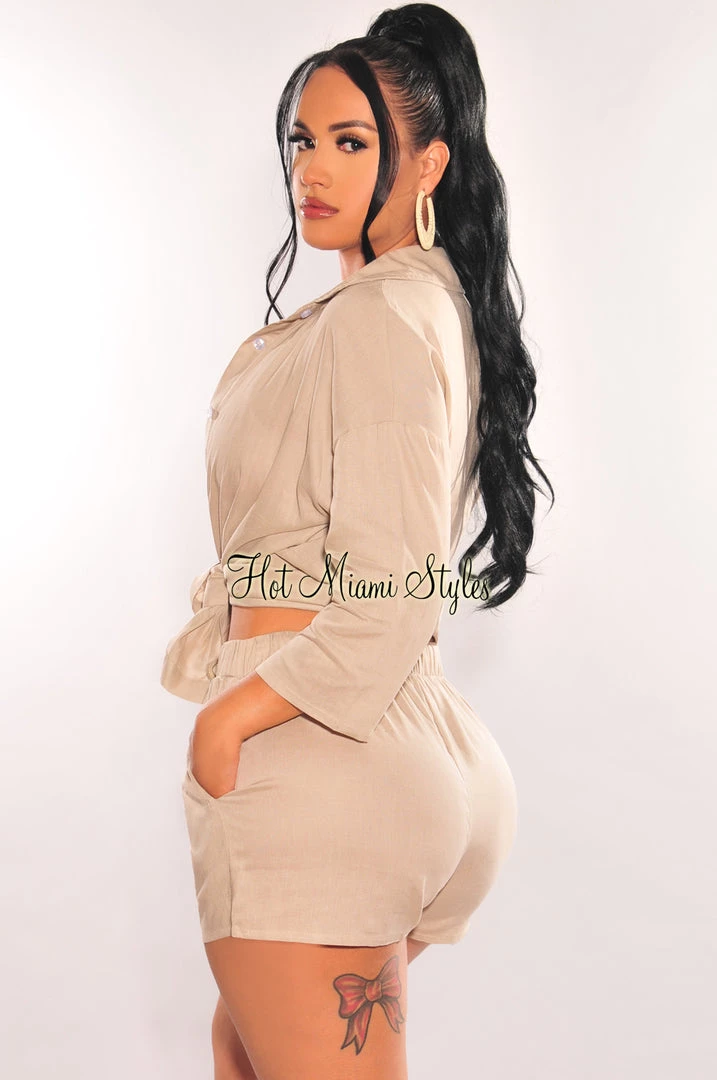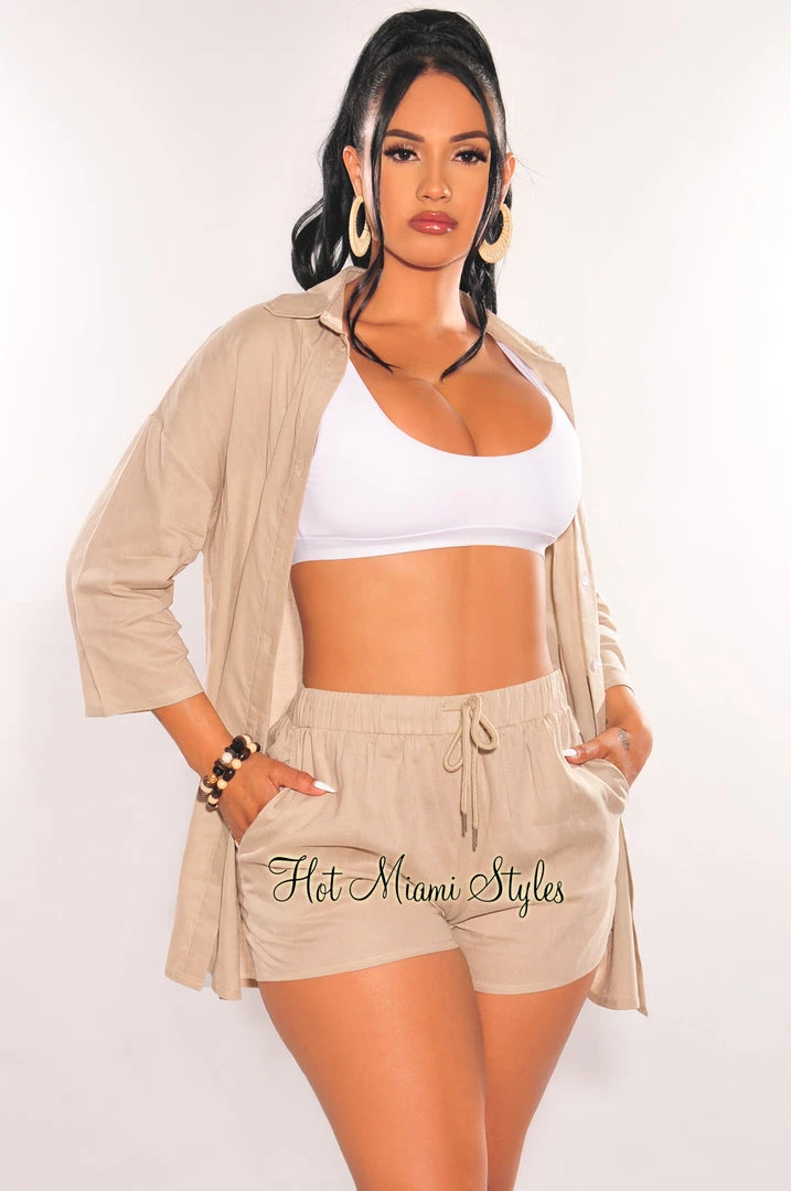 An off duty staple for a true fashionista, our taupe linen collared button up ¾ Sleeves shorts two piece set speaks chic like no other.