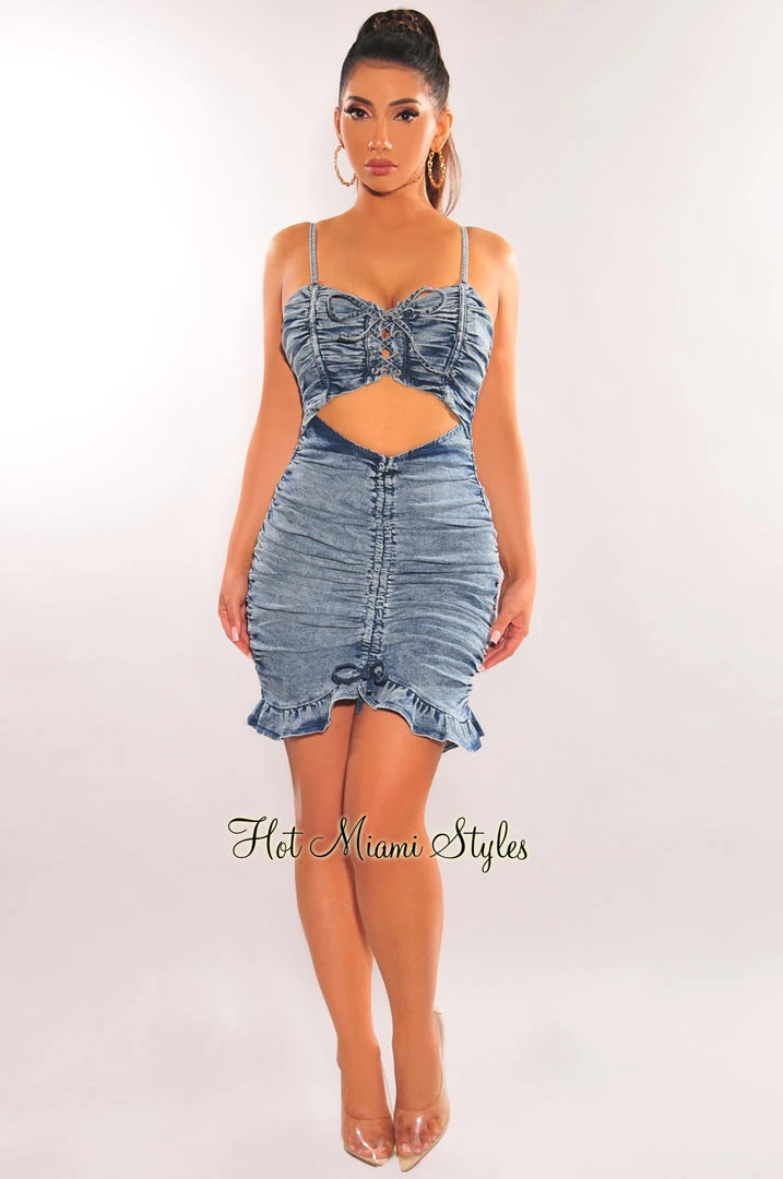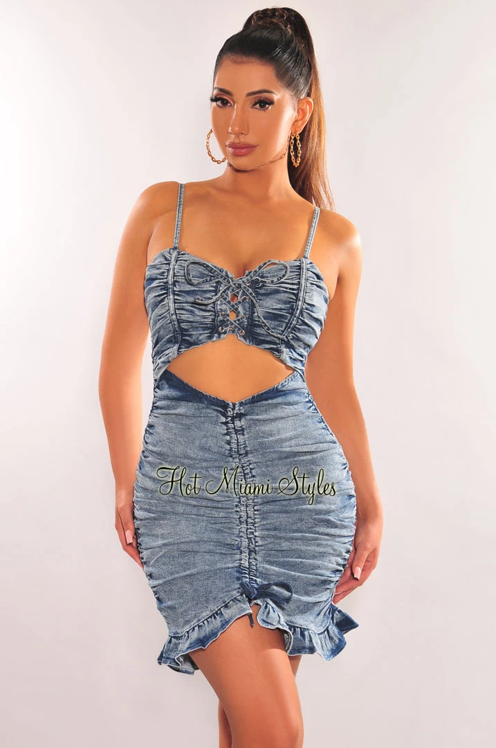 We are obsessing over this denim wash ruched dress. Featuring spaghetti straps and cut out and ruffle details.