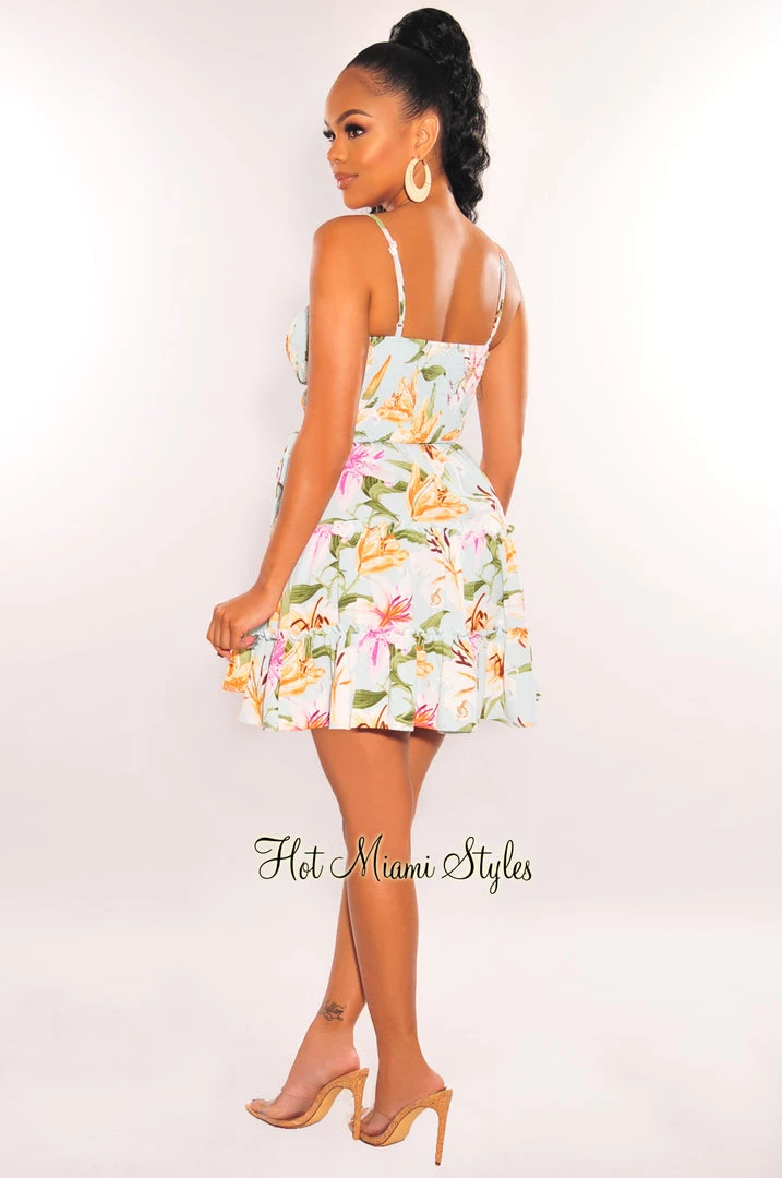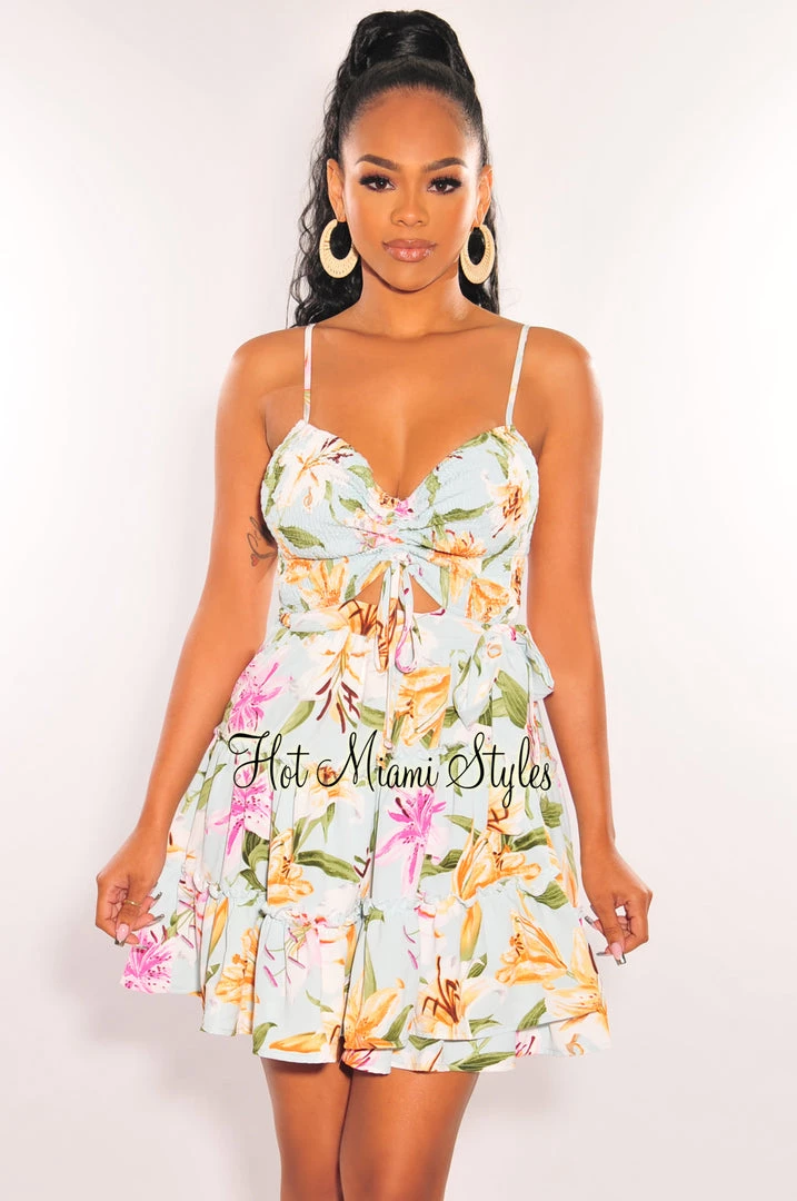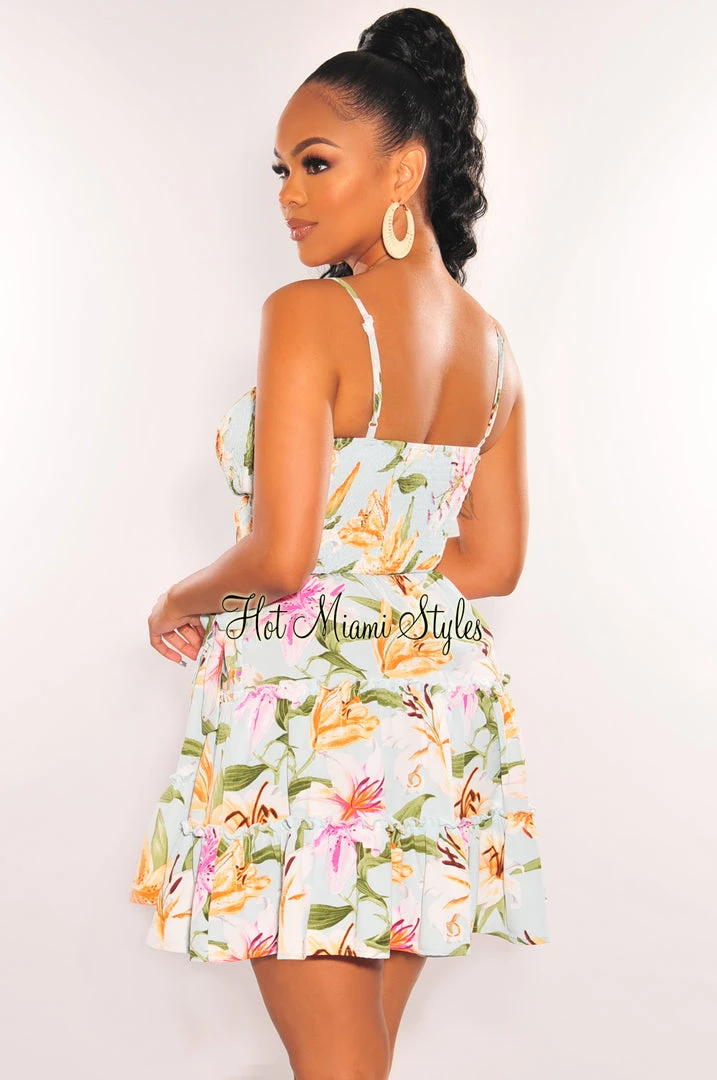 Oh baby! This mint flirty floral print smocked baby doll dress is the perfect brunch fit. Featuring spaghetti straps, ruffle details and wrap tie up design.