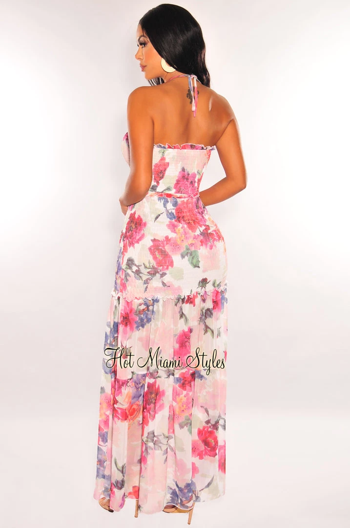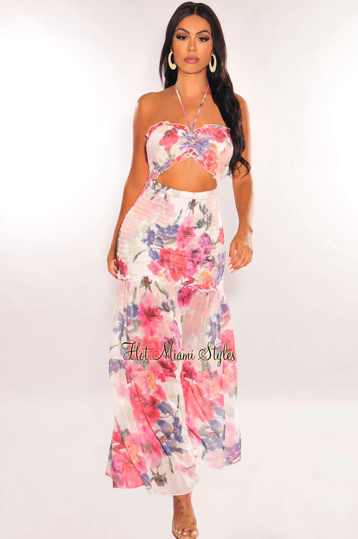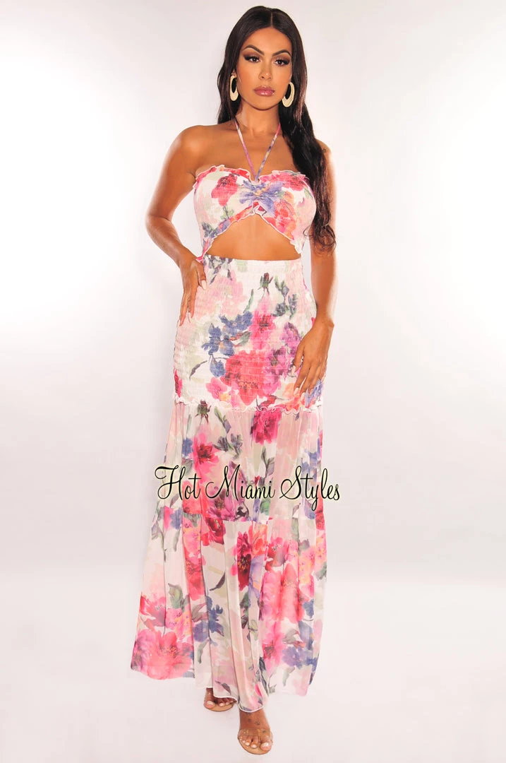 Make a statement on your next vacay. Featuring ruching and smocked details with ruffle trim and cut out design on a maxi length.