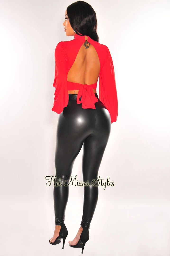 Feel sexy and in style in this cherry long sleeves crop top. Features a keyhole at front and back, with an open back tie up sash detail on a mock neck design. Pair with your favorite HMS bottoms for the perfect fit.