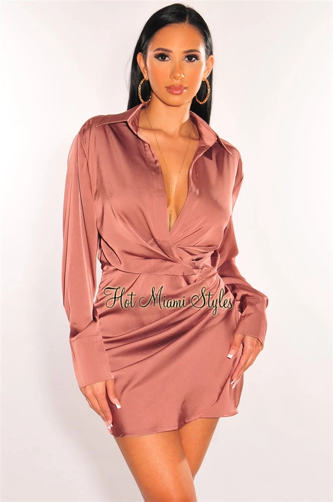 Dress it up or down, this mauve silky collared dress is perfect for weekend events. Featuring long sleeves, knotted detail and sultry slit.