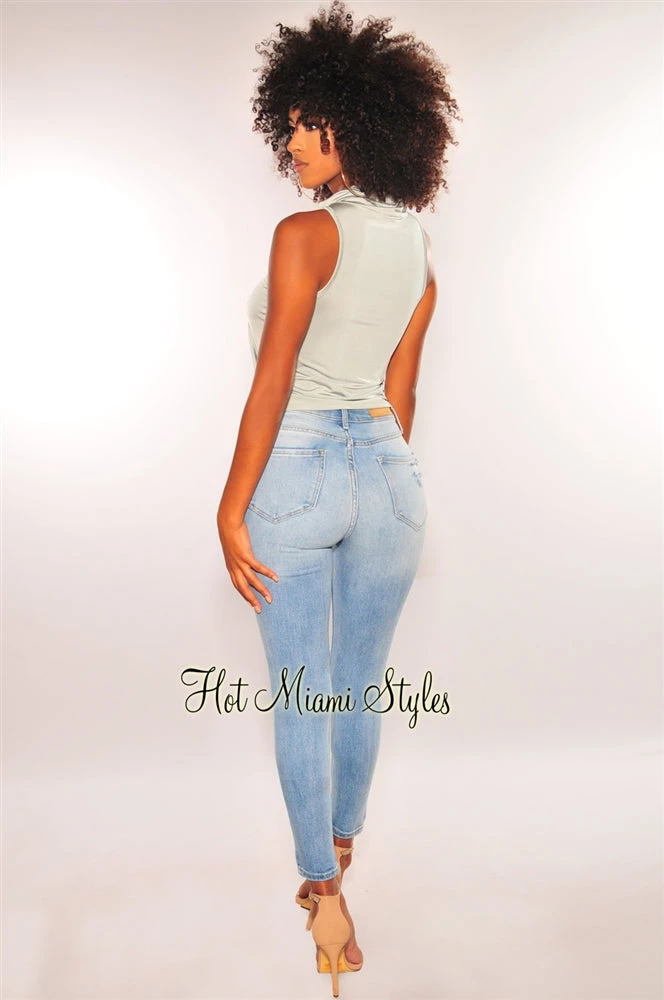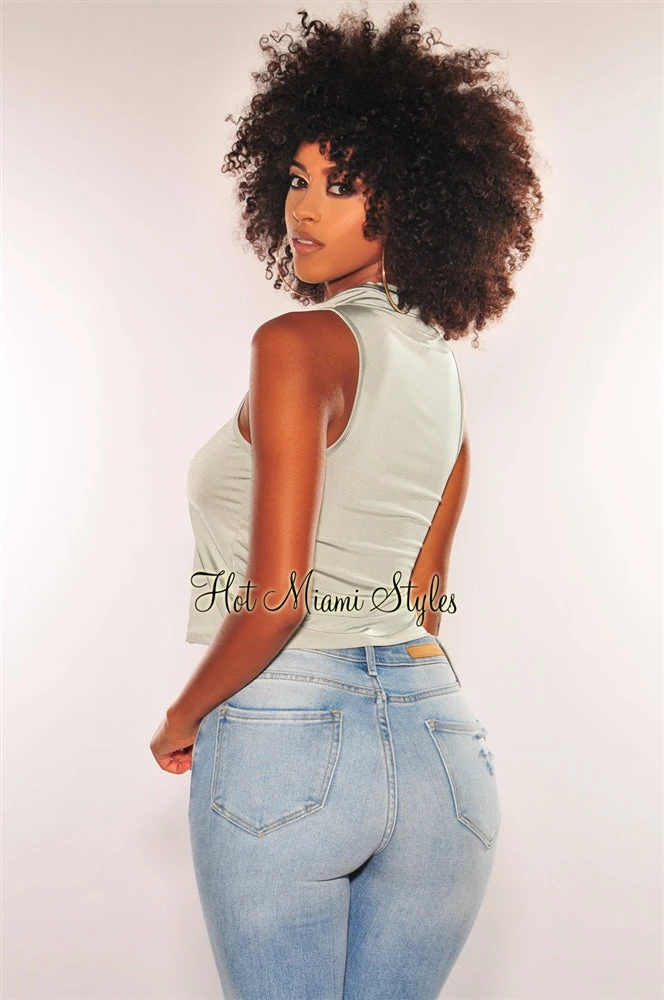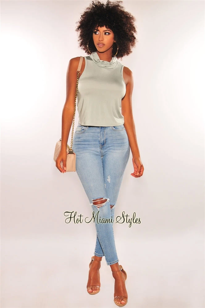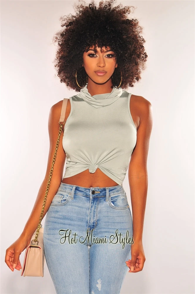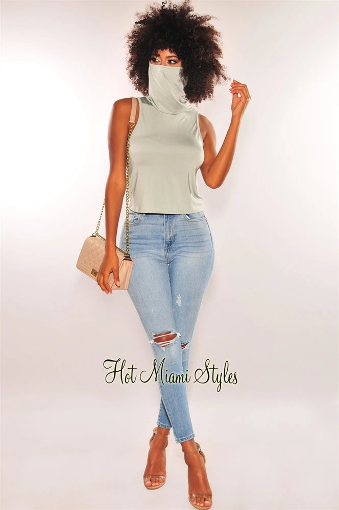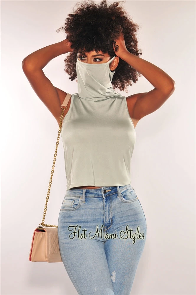 Fit right in the new “norm” style with this sage silky facemask top. Designed with a convenient attached face mask that also plays as a stylish cowl neckline to this sleeveless top.