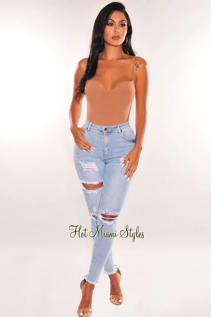 Your new favorite pair of denim for all your go to looks have arrived! These light denim wash jeans feature distressed details and a frayed hem. Pair with your favorite HMS bodysuit or cropped top.Â