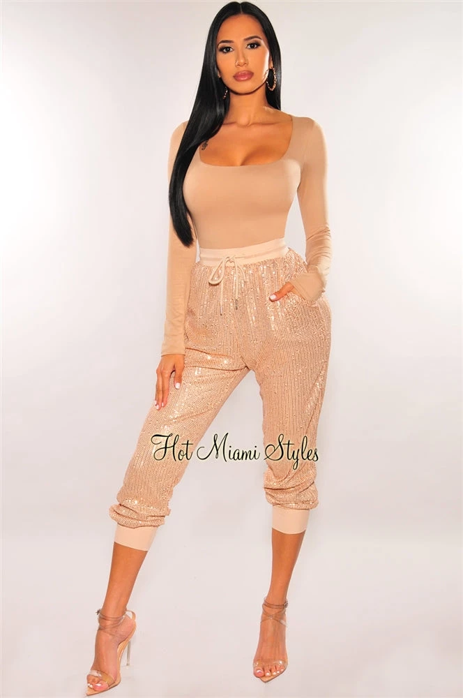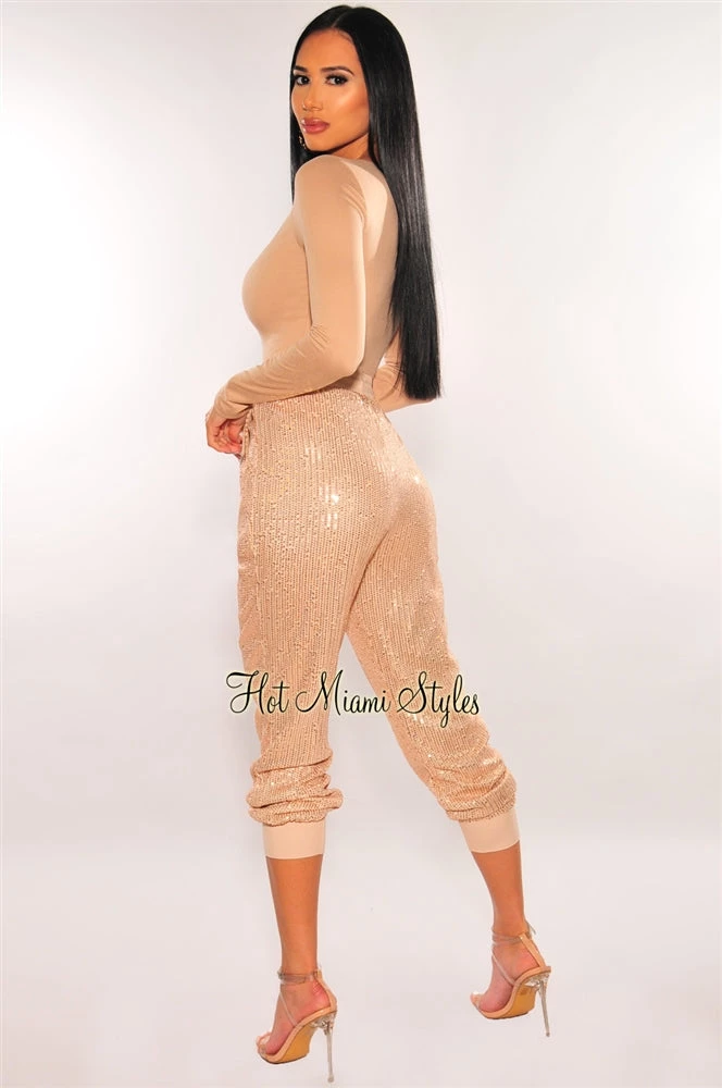 These pair of pants are for sure going to steal all the looks! Pair with your favorite bodysuit, or crop top for a glamorous look. Features an all over sequins bodice on a high waist drawstring waistband jogger style pants.