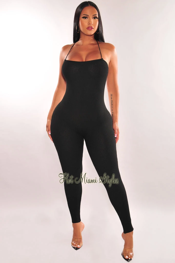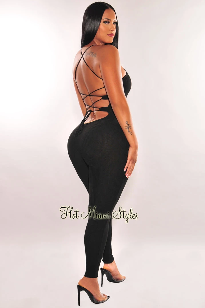 Make a statement and show off your curves anywhere you go in this ribbed knit jumpsuit. Featuring a strapless neckline and lace up back.