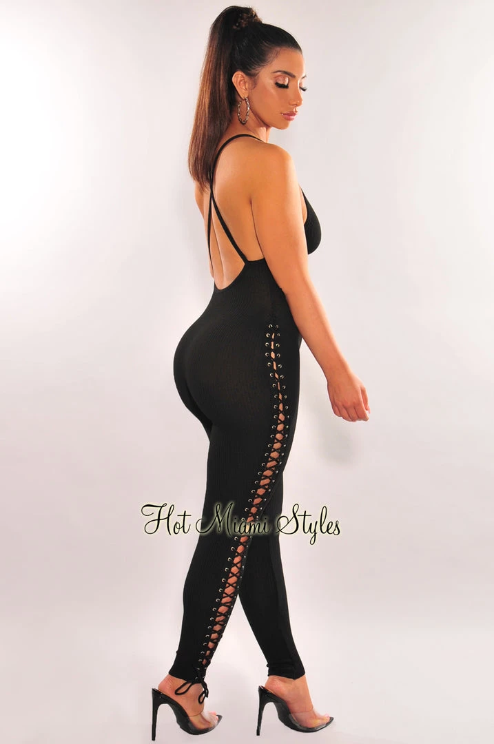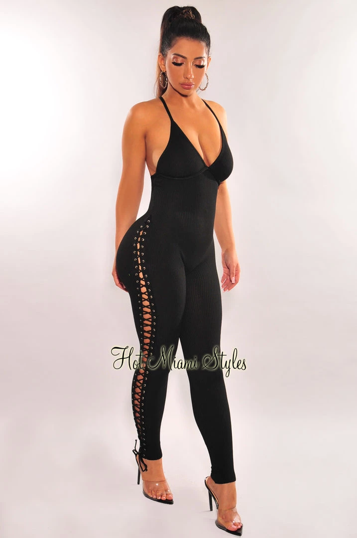 Make a statement and show off your curves anywhere you go in this ribbed knit jumpsuit. Featuring a criss cross design and lace up side.