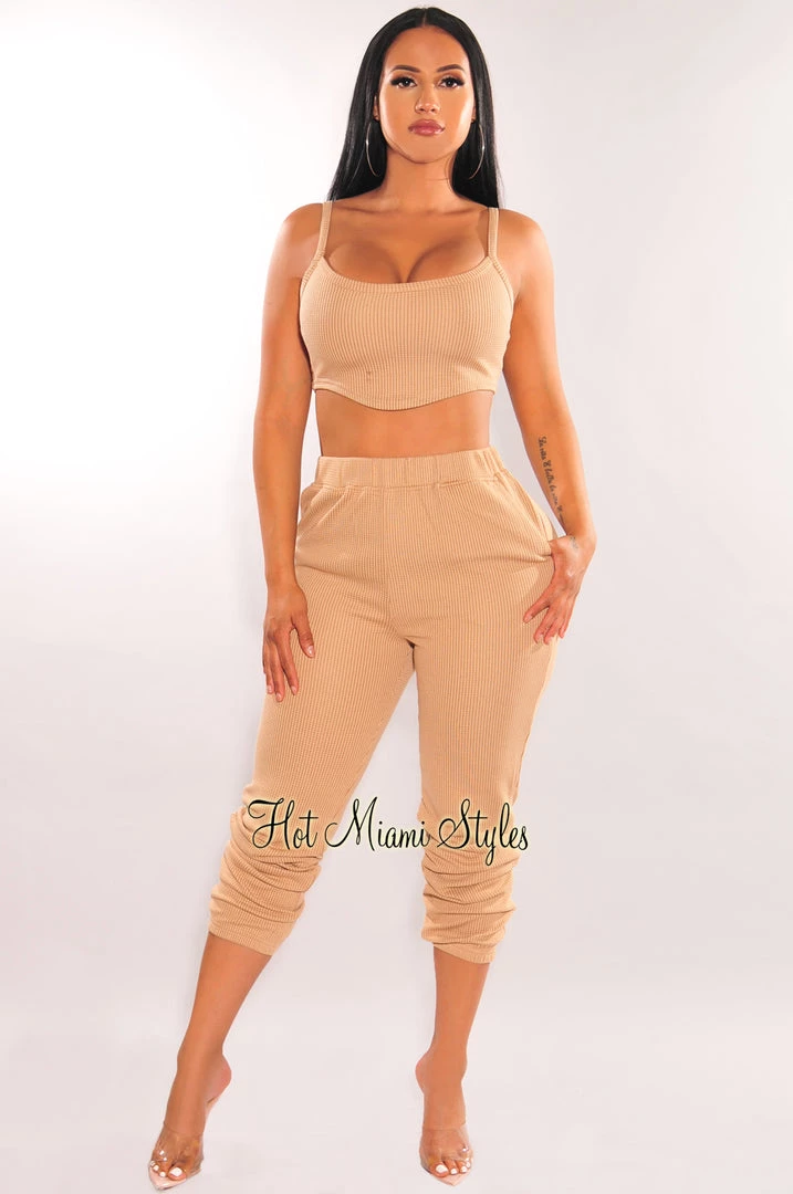 We are obsessing over this set for your off-duty wardrobe. Featuring a textured tank with curved hem and matching high waist joggers.
