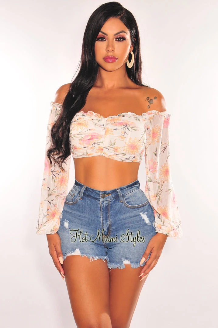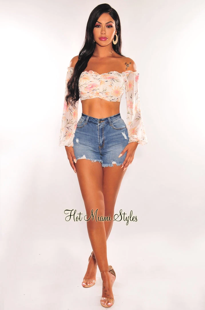 This off white floral long sleeves top is a must-have. An off shoulder silhouette makes this beaut a perfect choice for the season.