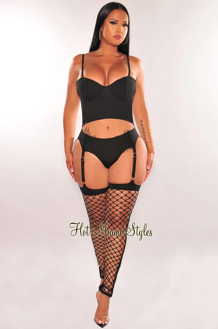 We are obsessing over this padded cut out jumpsuit. Made with adjustable spaghetti straps, fishnet detail and garnet design.Â