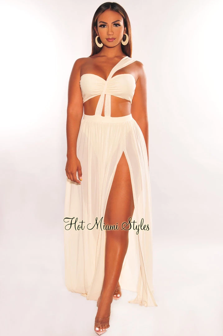 Designed with the thought of you, this cream dress is sure to make a statement. Features a one shoulder neckline, a cut out side design on a maxi silhouette.Â