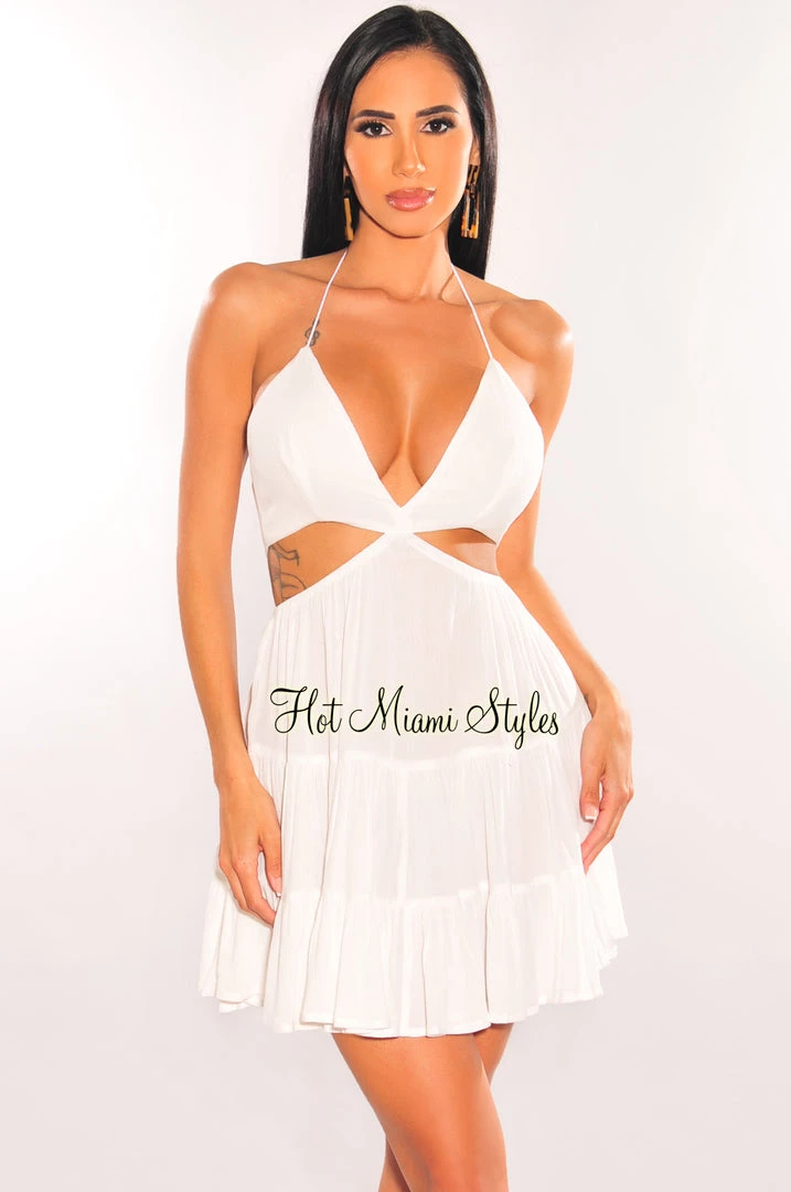 Add some luxe to your weekend wardrobe with this white halter baby doll dress. Made with a cut out detail and a lace up back design.