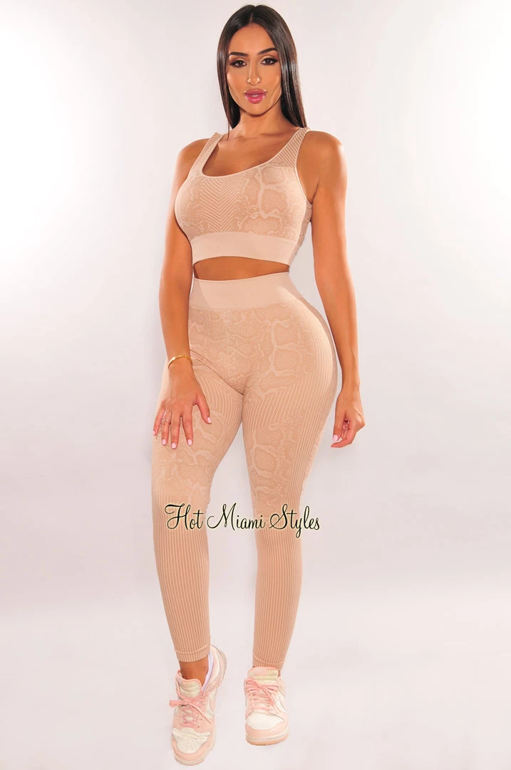 Amp up your wardrobe with this blush nude animal print two piece set. Featuring a cropped top and matching high waist leggings with a stretchy seamless bodice.