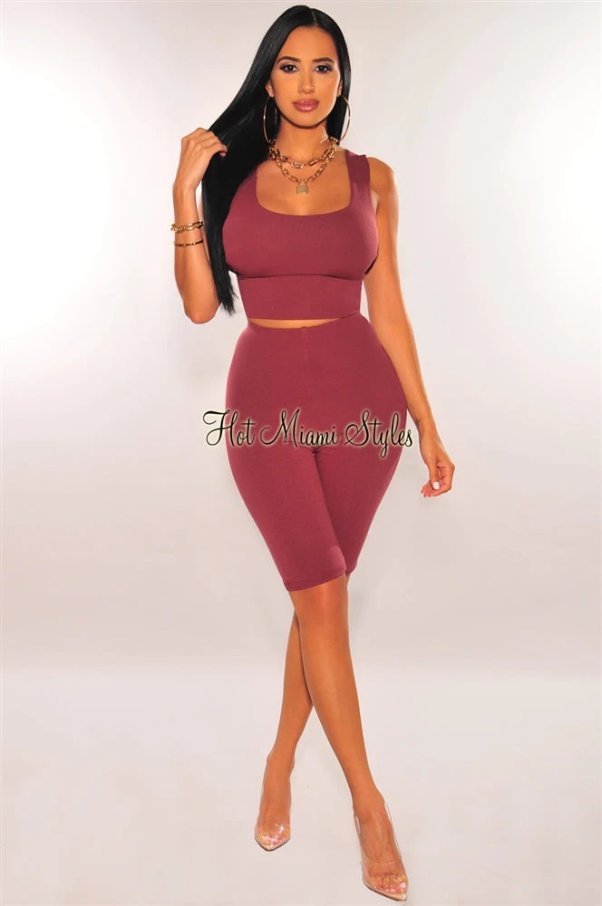 HMS Essential: Earn major style points in our merlot set. Features a tank style top and matching high waist biker shorts. Made of stretchy double-layered fabric which is made to give shape and support to your body.