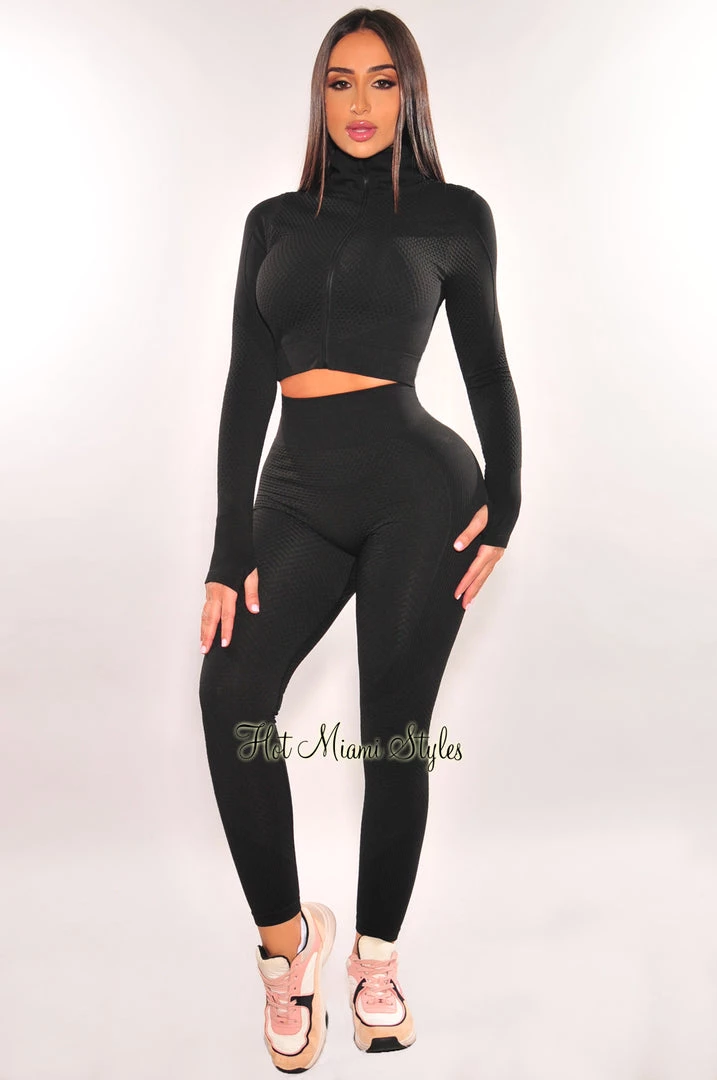 HMS Fit: Designed to fit like a glove and enhance your assets. This two piece set is made of stretchy textured fabric for a flattering fit. The top features a zipper long sleeves jacket and matching high waist leggings.