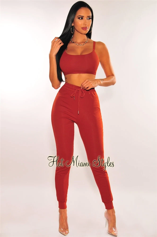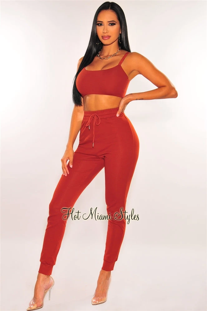 HMS Lounge: Chill out in this cute two piece set! Featuring an elastic straps crop top with matching high waisted jogger legging pants that will hug your assets.