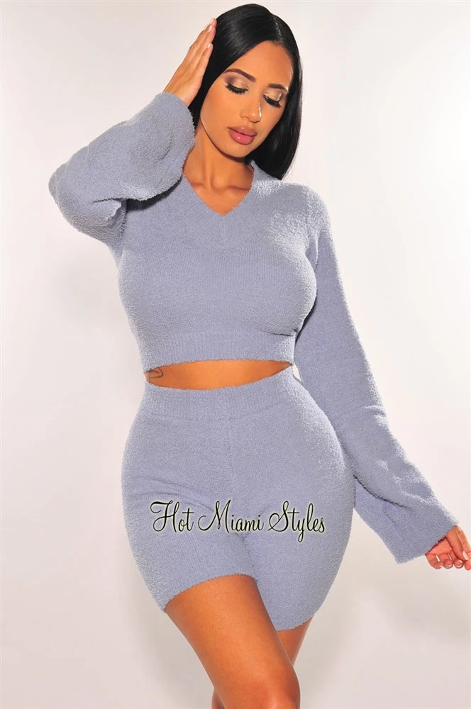 Sole Mio (set) HMS Lounge: Baby Blue Fuzzy Bell Sleeves Biker Shorts Two Piece Set Just In
