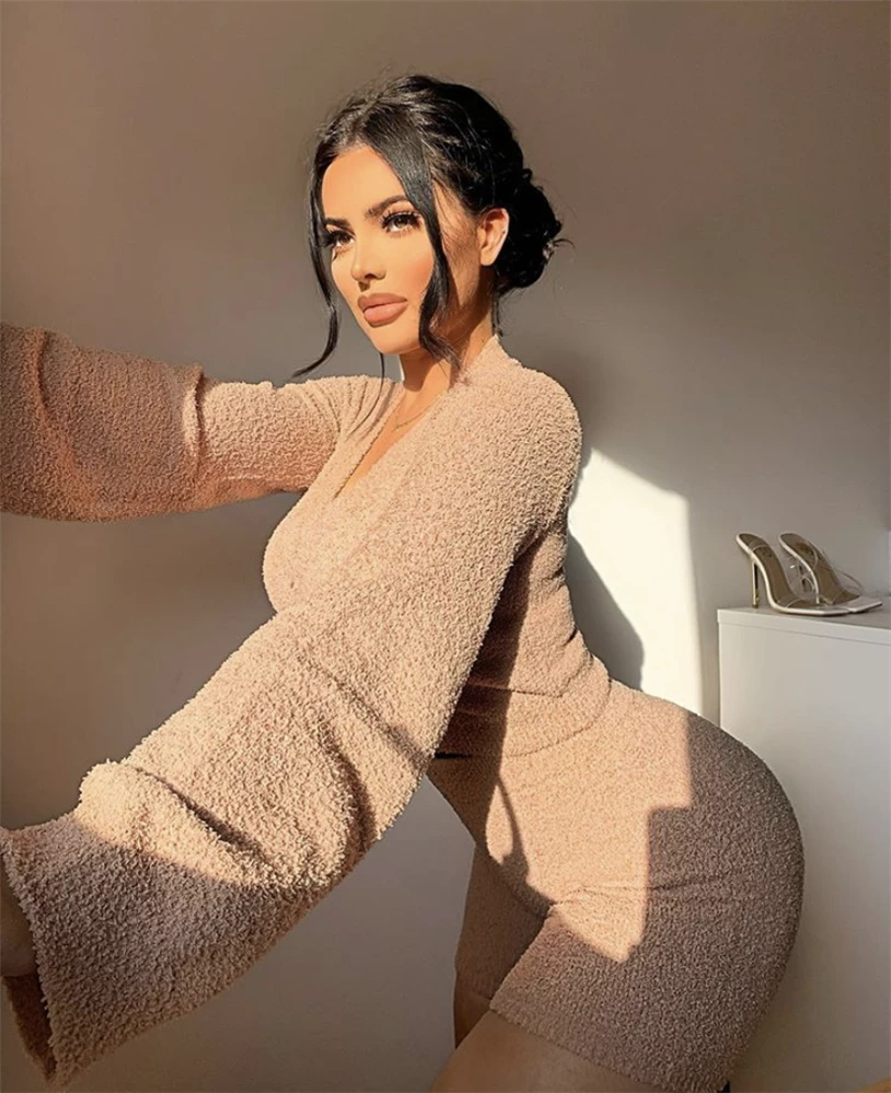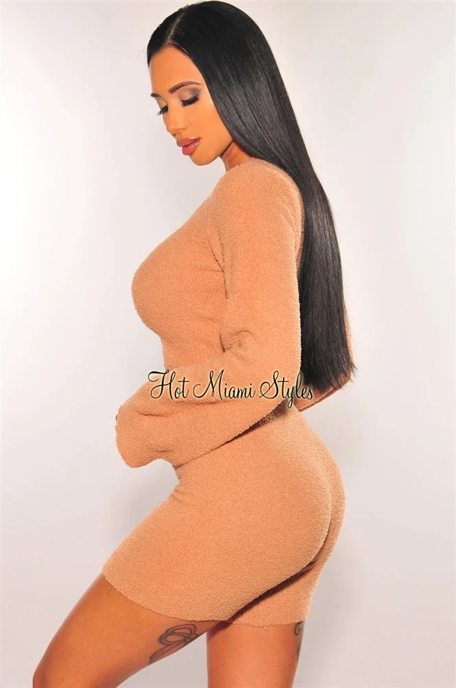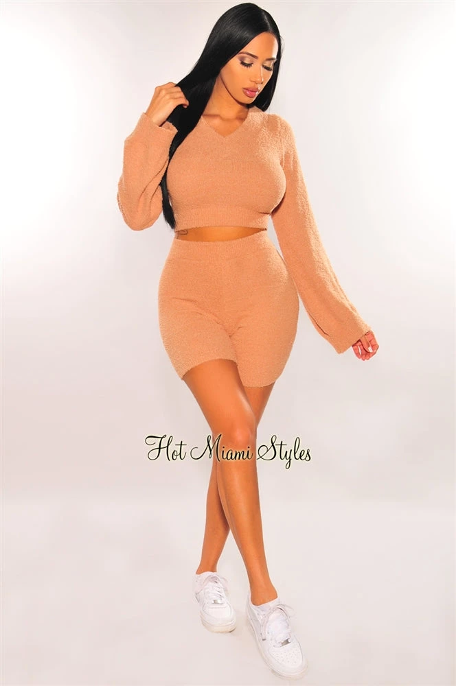 HMS Lounge: The most comfortable stay at home fit! This comfy shorts two piece set features a super soft fuzzy bodice that you won’t want to take off. Includes a long sleeves crop top and a hugging matching bottom.