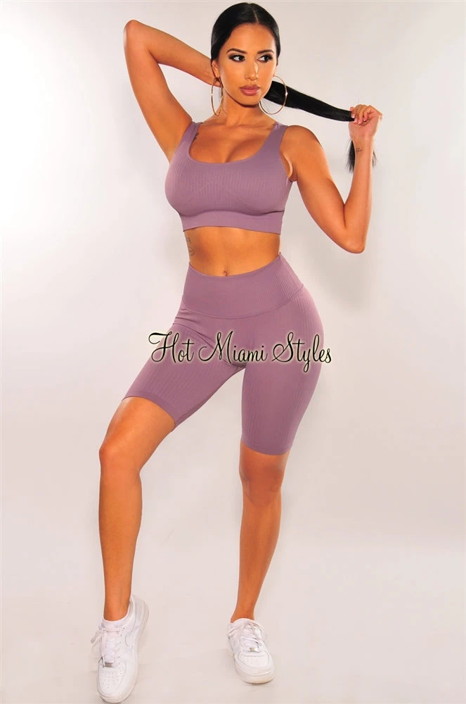 All the comfy feels in this purple haze biker shorts set. Features a cropped