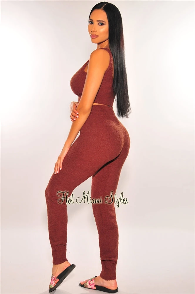 HMS Lounge: We got you with all the stylish cozy feels! Featuring a super soft fuzzy bodice in a tank crop top and matching high waist jogger pants to complete the look.
