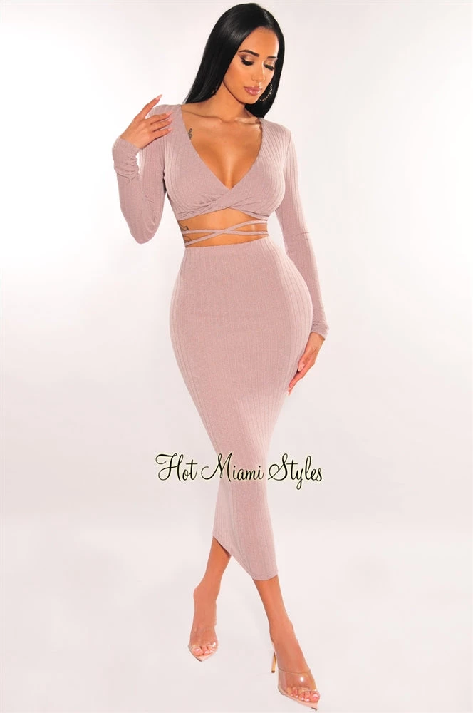 Deliver super cute cozzy vibes in this skirt two piece set. Made with a soft ribbed knit bodice on a long sleeve wrap around crop top and matching midi skirt to complete the look.