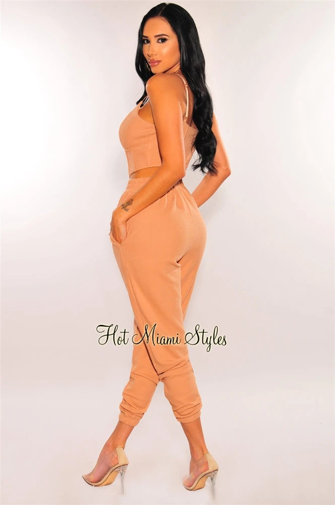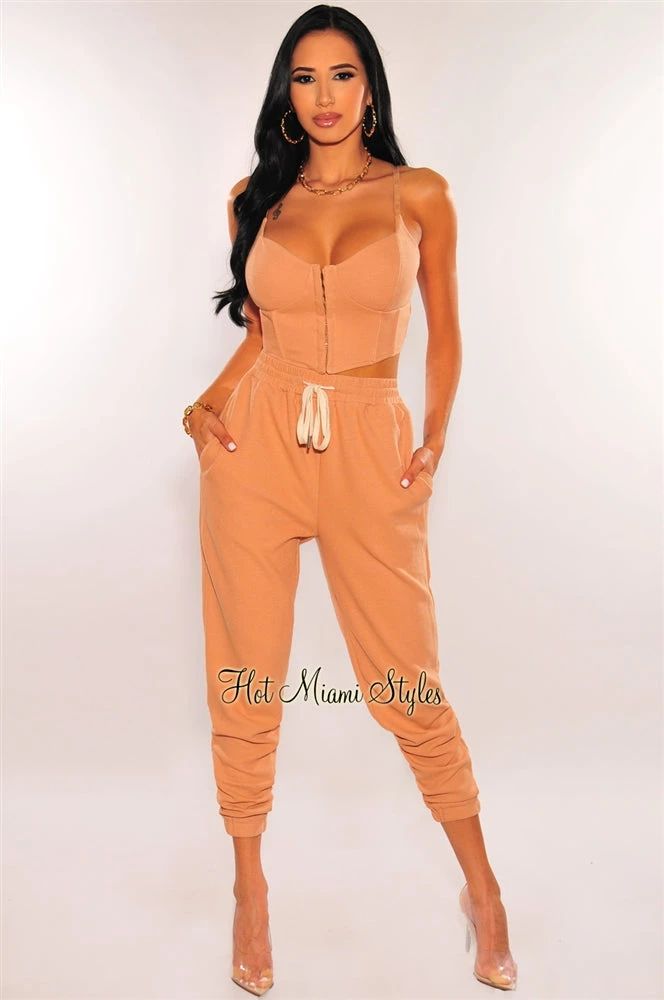 We are obsessing on two piece sets! This one featuring a super stylish with boning detail at top comes with matching high waisted jogger pants to complete the look.