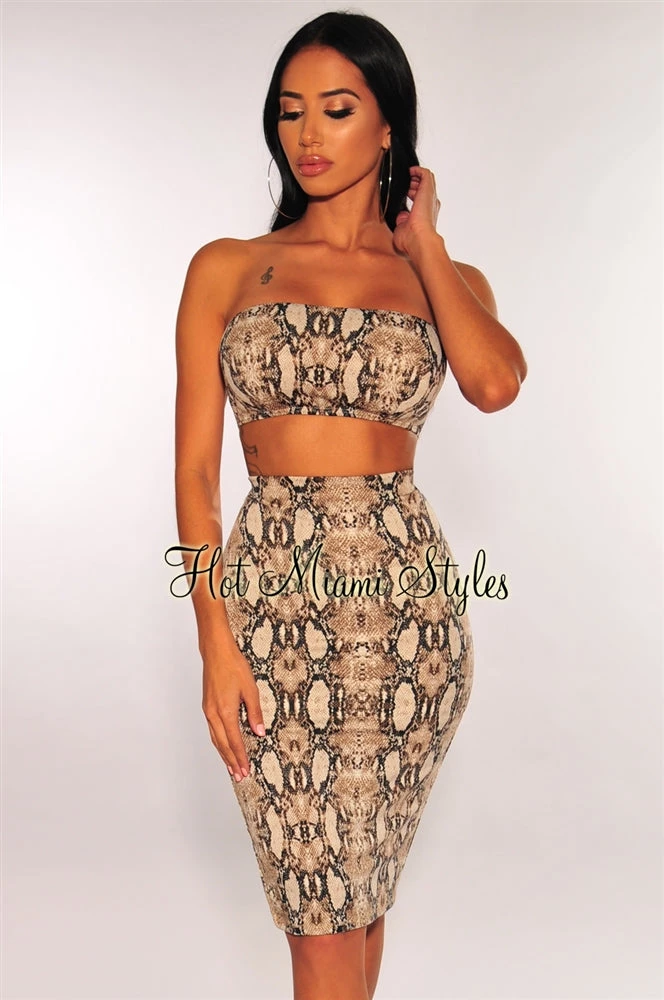 Be all kind of goals in this snake print set. Features a bandeau top and matching high waist skirt made to give you an hourglass shape.