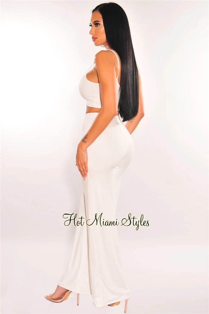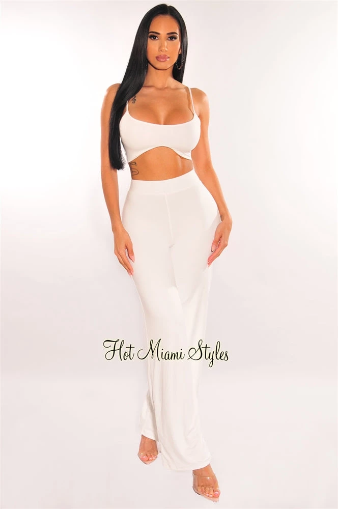 Amp up your chic style with our super cute two piece set. Features a spaghetti straps crop top with an appealing inverted hem and matching high waist palazzo pants to complete the look.