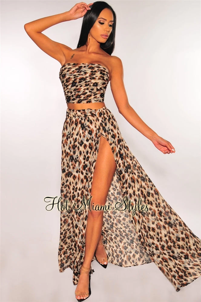 Flow into the weekend in this luxurious leopard print two piece set. The strapless crop top features smocked stretch at the back for a perfect; and the matching high waist skirt features a flirty side slit and a smocked waistband to snatch your waist.